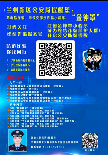 據(jù)悉,甘肅建投新區(qū)公司歷來重視員工反電信網(wǎng)絡(luò)詐騙的教育宣傳工作,與轄區(qū)派出所建立了良好的合作關(guān)系,積極配合派出所在甘肅建投蘭州新區(qū)產(chǎn)業(yè)園區(qū)內(nèi)的相關(guān)工作順利開展,公司員工現(xiàn)已全員注冊(cè)公安部反詐騙微信小程序“金鐘罩”。