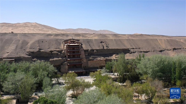 這是世界文化遺產(chǎn)莫高窟的標志性建筑——第96窟窟外木構(gòu)建筑九層樓(2022年4月18日攝,無人機照片)。新華社記者 陳斌攝