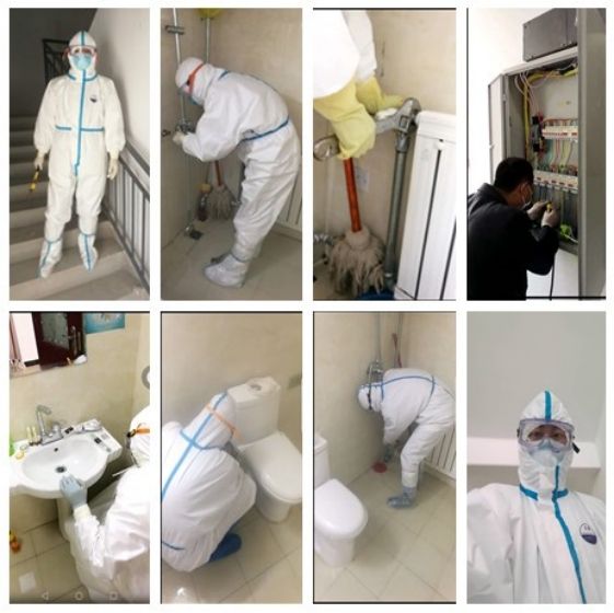 近500個(gè)房間的水、電、暖維修以及臨時(shí)帳篷的通水、通電,諸如地漏排水不暢、燈管燒壞、防水滲漏、暖氣不熱、房?jī)?nèi)無(wú)熱水等問(wèn)題時(shí)不時(shí)發(fā)生,門把手壞了、電冰箱接電、帳篷接電等等,這些高強(qiáng)度、快節(jié)奏的維修工作,一樁樁、一件件無(wú)不需要維修人員進(jìn)行處理,每一個(gè)環(huán)節(jié)、每一個(gè)細(xì)節(jié)容不得絲毫麻痹松懈、馬虎大意,穿著防護(hù)服作業(yè),這無(wú)疑又給他們的工作增加了難度。