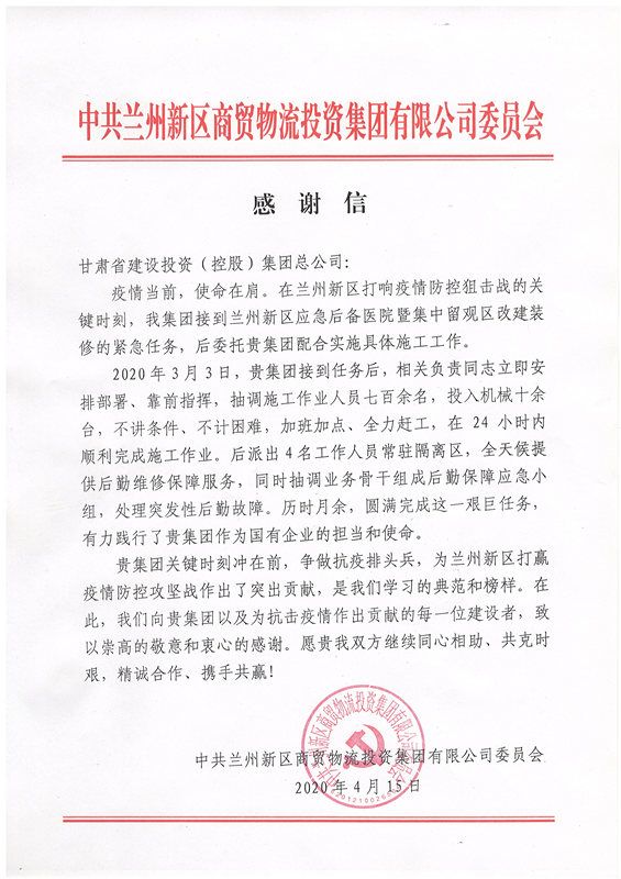 4月15日,一封字里行間滿懷真摯感謝的文件送到甘肅建投新區(qū)公司,文件中向甘肅建投的每一名建設(shè)者、維保者和工作人員致以崇高的敬意和衷心的感謝,這是全體人員無(wú)私付出贏得的嘉獎(jiǎng),這是共產(chǎn)黨員“守初心、擔(dān)使命”形成合力取得的成績(jī),這是甘肅建投沖在第一線“戰(zhàn)疫”樹(shù)起的榜樣。